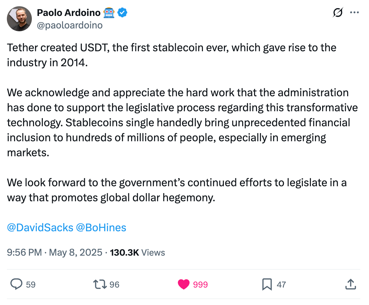 If the Genius Act passes, the U.S. will have a formal framework for approving and overseeing stablecoins. This means clear conditions for compliance, especially for those issued within U.S. borders. But it also means foreign stablecoin issuers like Tether will be formally categorized, and potentially restricted, in their interaction with U.S.-based platforms, payment channels, and financial institutions. Hence Paolo’s tweet: